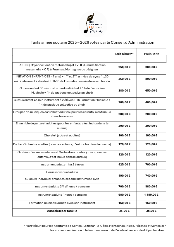 Tarifs 2025-2026